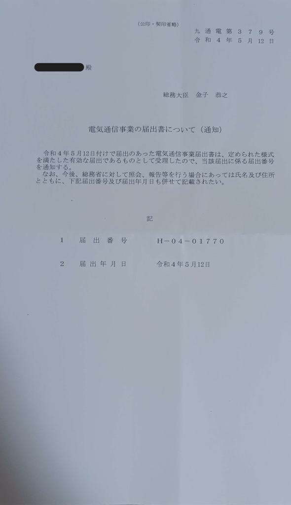 弊サーバーは、正式に九州総合通信局長により認可を受けております。